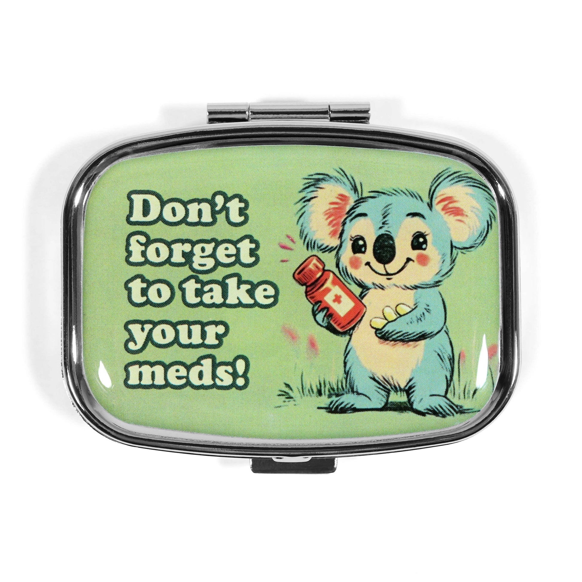 Bad Betty Greeting Co. Brighten your day with our metal pill box featuring the playful phrase "Don't Forget to Take Your Meds!" and an adorable koala holding a pill bottle. This charming pill organizer is both functional and fun, making it a perfect way to remember your daily medications. Compact and travel-friendly, this stylish case easily fits in your bag or pocket, ensuring you never miss a dose. Ideal as a cute gift for loved ones or a personal treat, this whimsical pill box combines practicality with a touch of personality. Keep your health on track with a smile! • Approximately 2-⅛" wide, 1-¼" length, ⅝" tall • Silver tone metal • Medical-grade ABS plastic insert with 2 compartments • Mirror • Secure latch