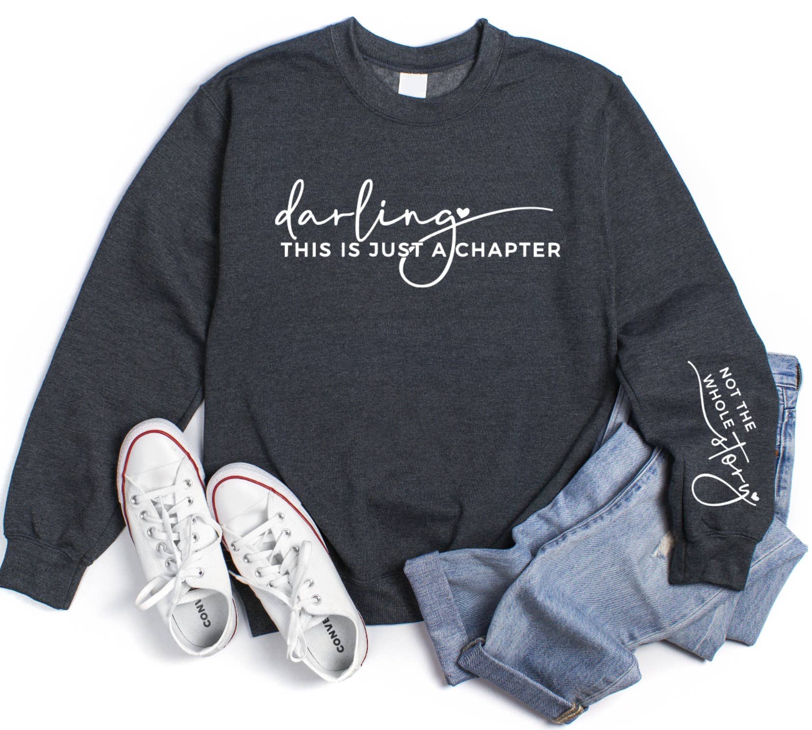 Exclusive Thredz- Darling This Is Just A Chapter. Dark Grey Heather 50/50 cotton/poly blend unisex fit screen printed on the front and sleeve