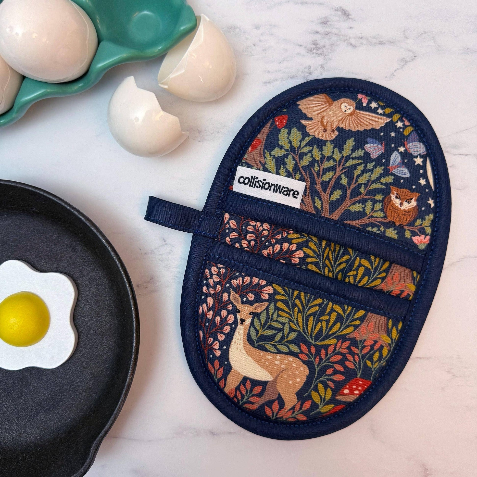 Collisionware- Forest Friends Mini Pincher Mitt. Forest animals are placed on a navy background with a navy blue lining and navy blue trim. Crafted with four layers of cotton batting, these mitts provide excellent heat resistance, making them perfect for baking, roasting, or handling hot dishes. Compact like a pot holder but with the convenience of an oven mitt. Dimensions: -Full size is 5 1/2" x 8". Each hand pocket is 3" x 4 1/2". Please note that the placement of the pattern may vary. Care Instructions: -Machine wash in cold or warm water, then tumble dry low or lay flat to dry. -Avoid using high heat during washing or drying to prevent shrinkage. Safety Note: -While these mitts are heat-resistant, they are not fireproof, so use caution around open flames.