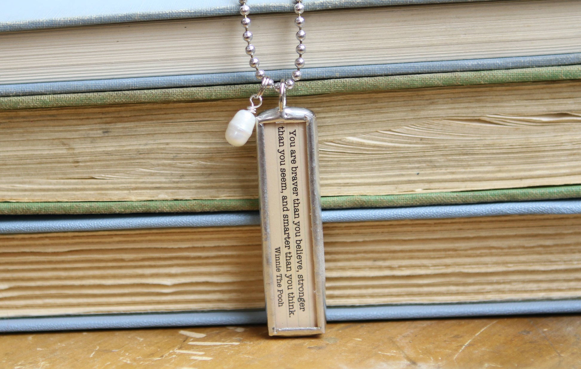 Jennifer Dahl Designs LLC- Winnie the Pooh. A.A. Milne Literary Book Charm Necklace. Our two-sided soldered charms are hand soldered in our Minnesota studio, so little variations are not only accepted, but expected and add to the charm of the piece. Materials: glass, paper, lead free + jewelry grade solder. Dimensions: Soldered charm 1/2" x 2". Ball chain: 30" with ball chain connector Freshwater Pearl